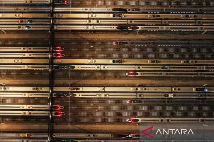 Foto drone menunjukkan kereta cepat di depot pemeliharaan di Tianjin, China, Senin (2/2/2026). ANTARA/Xinhua/Yang Baosen/aa.Pewarta: Xinhua