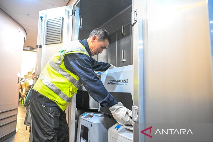 Seorang petugas menempatkan boks pengangkut hewan peliharaan ke dalam kereta cepat di Stasiun Kereta Barat Chongqing di Kota Chongqing, China, Senin (9/2/2026). ANTARA/Xinhua/Tang Yi/aa.