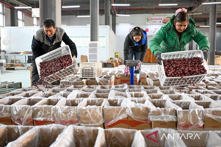 Para karyawan mengemas jujubes merah di sebuah perusahaan teknologi jaringan di Moyu County, Prefektur Hotan, Daerah Otonomi Xinjiang, Uygur, China, Jumat (9/1/2026). ANTARA/Xinhua/Ding Le/aa.