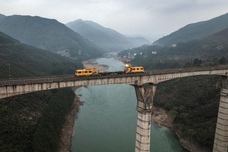 Sejumlah petugas China Railway Nanning Group Co., Ltd melakukan pemeliharaan di Daerah Otonom Etnis Zhuang Guangxi, China, pada 29 Januari 2026. (Xinhua/Zhang Ailin)
