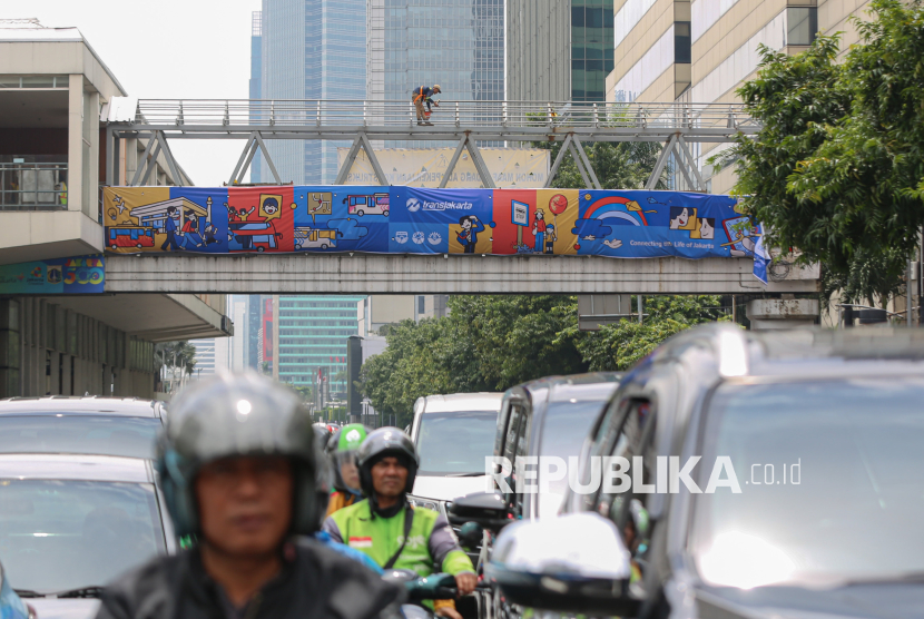 Pekerja menyelesaikan revitalisasi Jembatan Penyeberangan Orang (JPO) Sarinah, Jakarta, Rabu (14/1/2025). Pemerintah Provinsi DKI Jakarta membangun ulang JPO Sarinah untuk akses alternatif penyeberangan orang yang aman serta ramah disabilitas yang dilengkapi fasilitas lift untuk mendukung akses kelompok disabilitas, lansia dan ibu hamil. JPO Sarinah merupakan jembatan penyeberangan orang pertama yang dibangun di Indonesia yang bernilai sejarah tentang perjalanan transportasi dan tata kota Jakarta. (FOTO : Republika/Thoudy Badai)