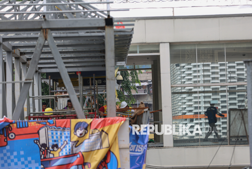 Revitalisasi Jembatan Penyeberangan Orang (JPO) Sarinah, Jakarta, Rabu (14/1/2025). Pemerintah Provinsi DKI Jakarta membangun ulang JPO Sarinah untuk akses alternatif penyeberangan orang yang aman serta ramah disabilitas yang dilengkapi fasilitas lift untuk mendukung akses kelompok disabilitas, lansia dan ibu hamil. JPO Sarinah merupakan jembatan penyeberangan orang pertama yang dibangun di Indonesia yang bernilai sejarah tentang perjalanan transportasi dan tata kota Jakarta. (FOTO : Republika/Thoudy Badai)