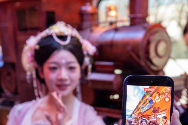 Seorang wisatawan mengambil foto di kereta bertema yang beroperasi dari Stasiun Kereta Beijing ke Stasiun Kereta Utara Tianjin pada 1 Januari 2026. (Xinhua/Zhang Fan)Pewarta: Xinhua
