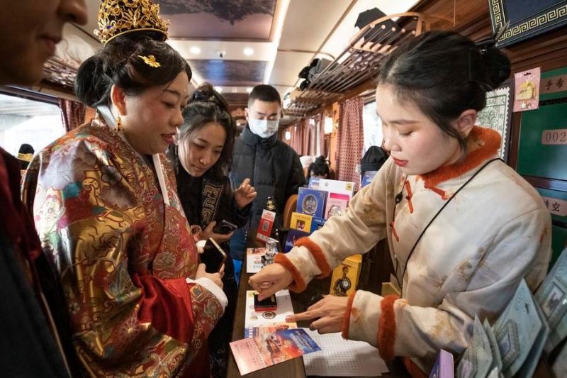 Sejumlah wisatawan membeli amplop dan kartu pos komemoratif di kereta bertema yang beroperasi dari Stasiun Kereta Utara Tianjin ke Stasiun Kereta Beijing pada 1 Januari 2026. (Xinhua/Zhang Fan)
