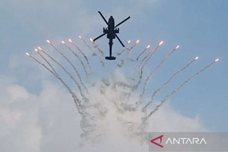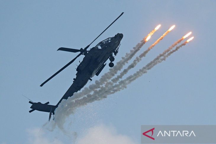 Helikopter AH-64D Apache Angkatan Udara Republik Singapura (RSAF) tampil selama pratinjau media untuk Singapore Airshow ke-10 di Singapura, Minggu (1/2/2026). ANTARA/Xinhua/Then Chih Wey/aa.Pewarta: Xinhua