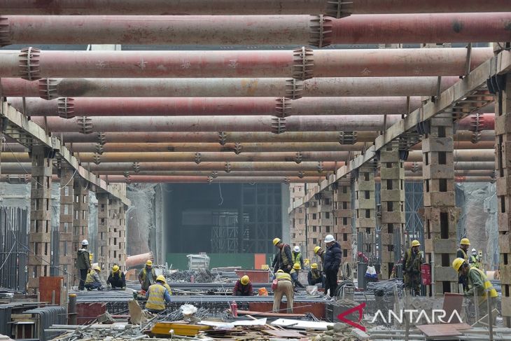 Para pekerja terlihat menyelesaikan pekerjaan konstruksi proyek peningkatan Stasiun Kereta Chengdu di Chengdu, Provinsi Sichuan, China, Rabu (28/1/2026). ANTARA/Xinhua/Liu Kun/aa.Pewarta: Xinhua