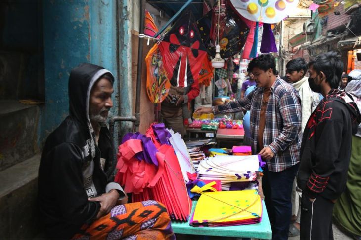 Orang-orang membeli layang-layang saat perayaan festival Shakrain di Dhaka, Bangladesh, pada 14 Januari 2026. (Xinhua/Habibur Rahman