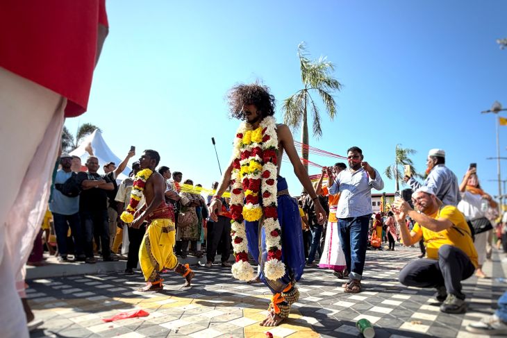 Sejumlah umat Hindu di Malaysia merayakan festival Thaipusam di Gua Batu, Gombak, Selangor, Malaysia, Minggu (1/2/2026). (ANTARA/Rangga Pandu Asmara Jingga)Sementara itu pada Sabtu (31/1) Perdana Menteri Malaysia Anwar Ibrahim telah meninjau lokasi perayaan Thaipusam di Batu Caves – yang ikonik dengan keberadaan patung Dewa Murugan berwarna emas, setinggi 42,7 meter.