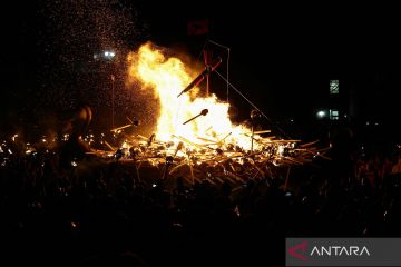 Ribuan peserta melemparkan obor saat Festival Up Helly Aa di Lerwick, Kepulauan Shetland, Inggris, Selasa (27/1/2026). Festival api terbesar di Eropa tersebut menandai akhir musim Natal. ANTARA FOTO/REUTERS/Toby Shepheard/agr