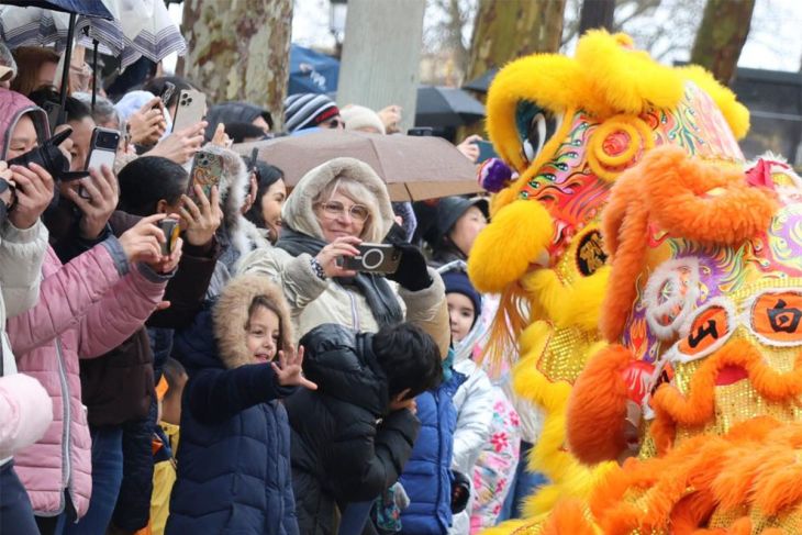 Orang-orang menyaksikan pertunjukan barongsai saat parade menyambut Tahun Baru Imlek di jalan Champs-Elysees di Paris, Prancis, 1 Februari 2026. (Xinhua/Zhang Baihui) Pewarta: Xinhua