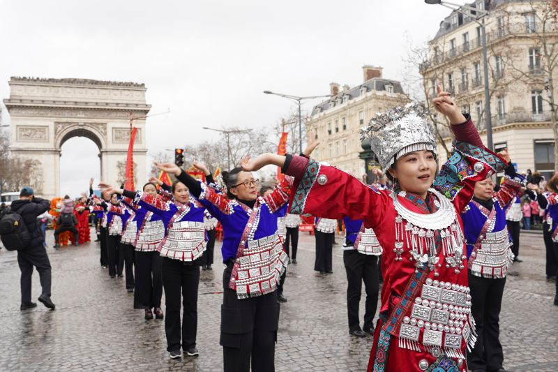 Orang-orang yang mengenakan pakaian tradisional China tampil dalam parade penyambutan Tahun Baru Imlek di jalan Champs-Elysees di Paris, Prancis, pada 1 Februari 2026. (Xinhua/Zhang Baihui)