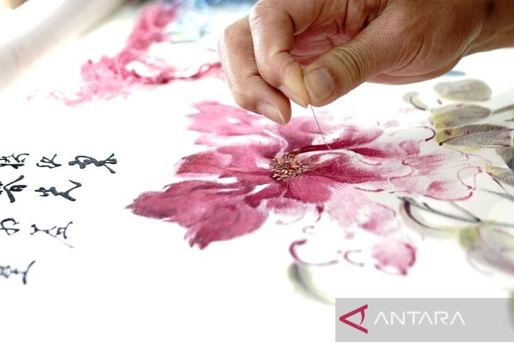 Seorang staf menunjukkan seni sulam di stan Provinsi Henan saat berlangsung China International Import Expo (CIIE) ke-8 di Shanghai, China, Jumat (7/11/2025). ANTARA/Xinhua/Zhang Jiansong/aa.