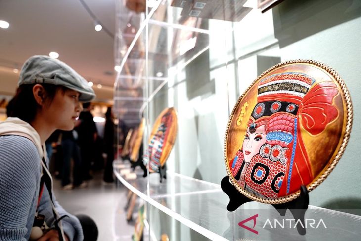 Seorang pengunjung melihat kerajinan kulit di stan Wilayah Otonom Mongolia Dalam Tiongkok saat berlangsung China International Import Expo (CIIE) ke-8 di Shanghai, China, Jumat (7/11/2025). ANTARA/Xinhua/Zhang Jiansong/aa.