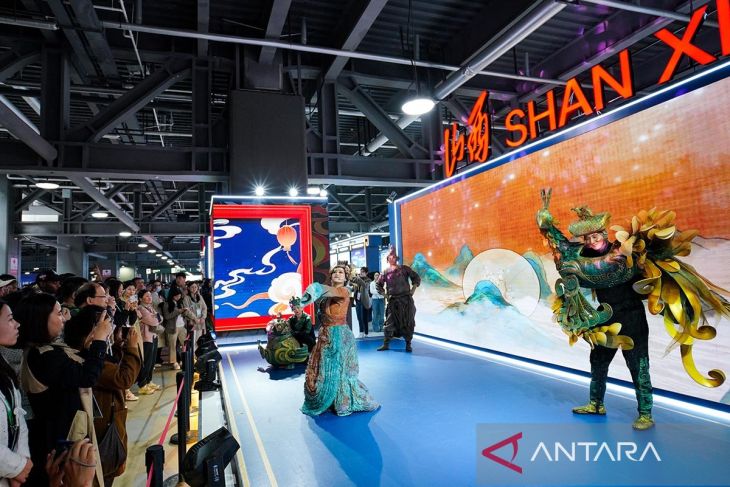 Pengunjung menyaksikan pertunjukan di stan Provinsi Shanxi saat berlangsung China International Import Expo (CIIE) ke-8 di Shanghai, China, Sabtu (8/11/2025). ANTARA/Xinhua/Fan Yuqing/aa.