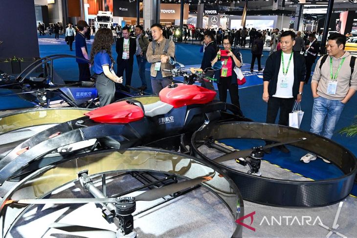 Pengunjung mempelajari tentang motor terbang di stan Hong Kong Blueprint Airlines Limited di area pameran Automobil dan Mobilitas Cerdas dalam Pameran Impor Internasional China (China International Import Expo/CIIE) ke-8 di Shanghai, China, Sabtu (8/11/2025). ANTARA/Xinhua/Cai Xiangxin/aa.