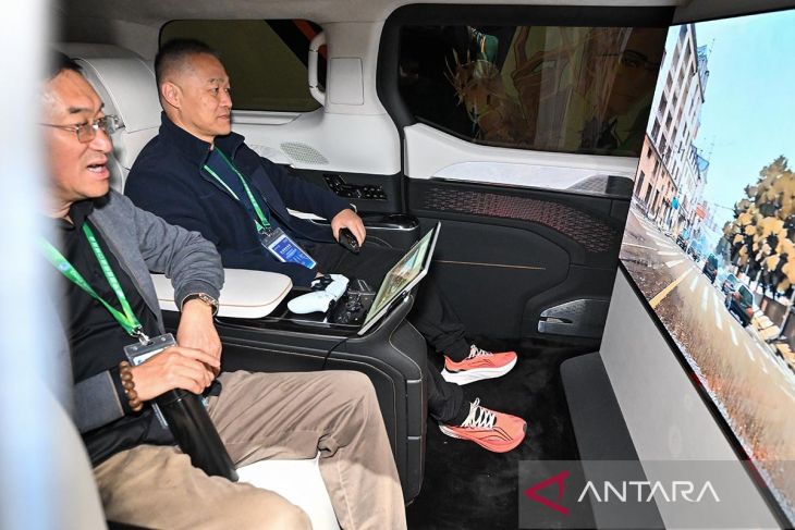 Pengunjung menjajal sistem hiburan di dalam mobil di stan Sony di area pameran Industri Cerdas dan Teknologi Informasi dalam Pameran Impor Internasional China (China International Import Expo/CIIE) ke-8 di Shanghai, China, Sabtu (8/11/2025). ANTARA/Xinhua/Cai Xiangxin/aa.
