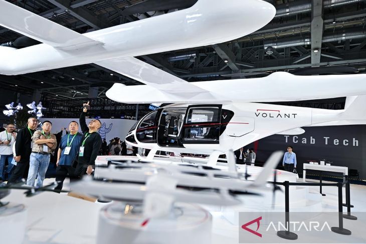 Sebuah pesawat lepas landas dan pendaratan vertikal listrik (electric vertical takeoff and landing/eVTOL) E20 terlihat di stan TCab Tech di area pameran Automobil dan Mobilitas Cerdas dalam Pameran Impor Internasional China (China International Import Expo/CIIE) ke-8 di Shanghai, China, Rabu (5/11/2025). ANTARA/Xinhua/Ren Pengfei/aa.