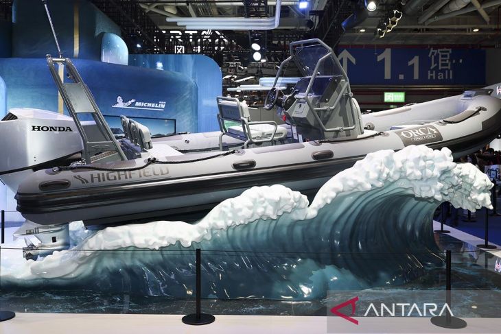 Perahu karet kaku berlapis komposit terlihat di stan Michelin di area pameran Otomotif dan Mobilitas Cerdas pada Pameran Impor Internasional Tiongkok (CIIE) ke-8 di Shanghai, China, Sabtu (8/11/2025). ANTARA/Xinhua/Wang Xiang/aa.Pewarta: Xinhua