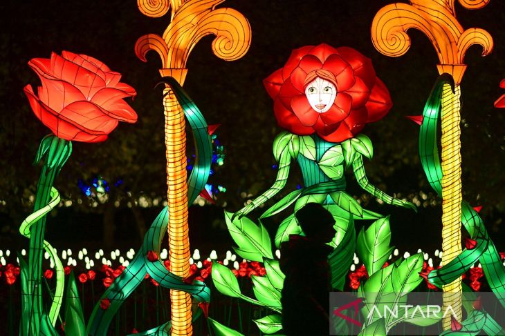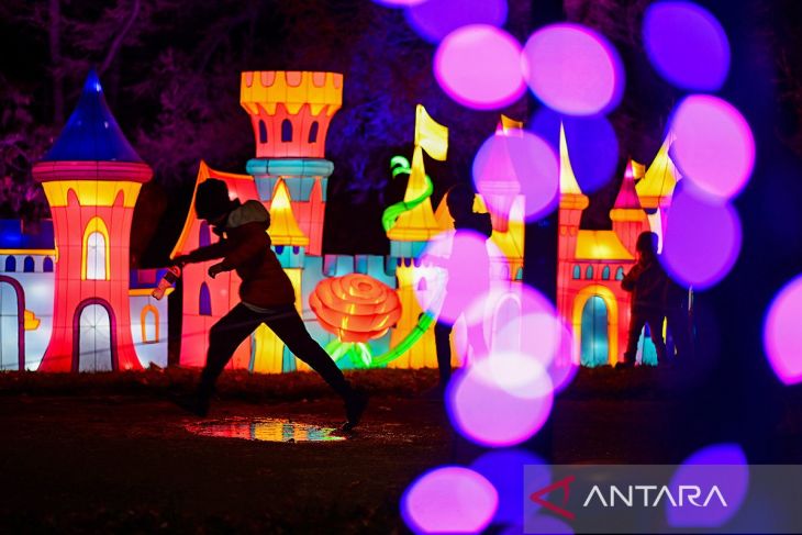 Seorang pengunjung menyaksikan deretan instalasi lampu pada pertunjukan Garden of Lights, Kebun Raya Akademi Ilmu Pengetahuan Polandia di pinggiran Kota Warsawa, Polandia, Sabtu (25/10/2025). Pameran tahun ini, yang mengusung tema "Si Cantik dan Si Buruk Rupa" (Beauty and the Beast), telah menarik perhatian banyak warga dan wisatawan. ANTARA/Xinhua/Aleksy Witwicki/aa.