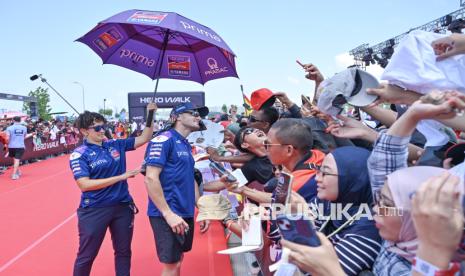 Pembalap Monster Energy Yamaha MotoGP Alex Rins (kiri) bersama pembalap Ducati Lenovo Team Francesco Bagnaia (tengah) membubuhkan tanda tangan pada buku penonton saat sesi MotoGP Hero Walk menjelang race MotoGP Indonesia 2025 di Sirkuit Internasional Pertamina Mandalika, Lombok Tengah, Nusa Tenggara Barat, Ahad (5/10/2025). MotoGP Hero Walk 2025 menghadirkan para pembalap berjalan di karpet merah yang disediakan dekat dengan area paddock dan VIP agar para penonton bisa berinteraksi, berfoto dan meminta tanda tangan ke para pembalap. (FOTO : ANTARA FOTO/Ahmad Subaidi)