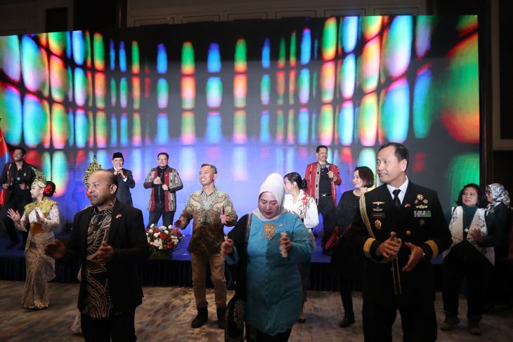 Duta Besar RI untuk Tiongkok dan Mongolia Djauhari Oratmangun, pejabat KBRI Beijing dan Warga Negara Indonesia yang tinggal di Ulan Bator dan sekitarnya bergerak mengikuti irama musik dalam resepsi diplomatik peringatan Hari Ulang Tahun (HUT) ke-80 RI di Ulan Bator pada Rabu (19/11/2025). /ANTARA/Desca Lidya Natalia."Atas nama KBRI Beijing, saya menyampaikan penghargaan dan terima kasih yang tulus atas kehadiran, perhatian dan dukungan yang senantiasa diberikan. Teman-teman adalah duta bangsa Indonesia di Mongolia, para duta 'people to people' yang menjembatani persahabatan antarbangsa," kata Dubes Djauhari.